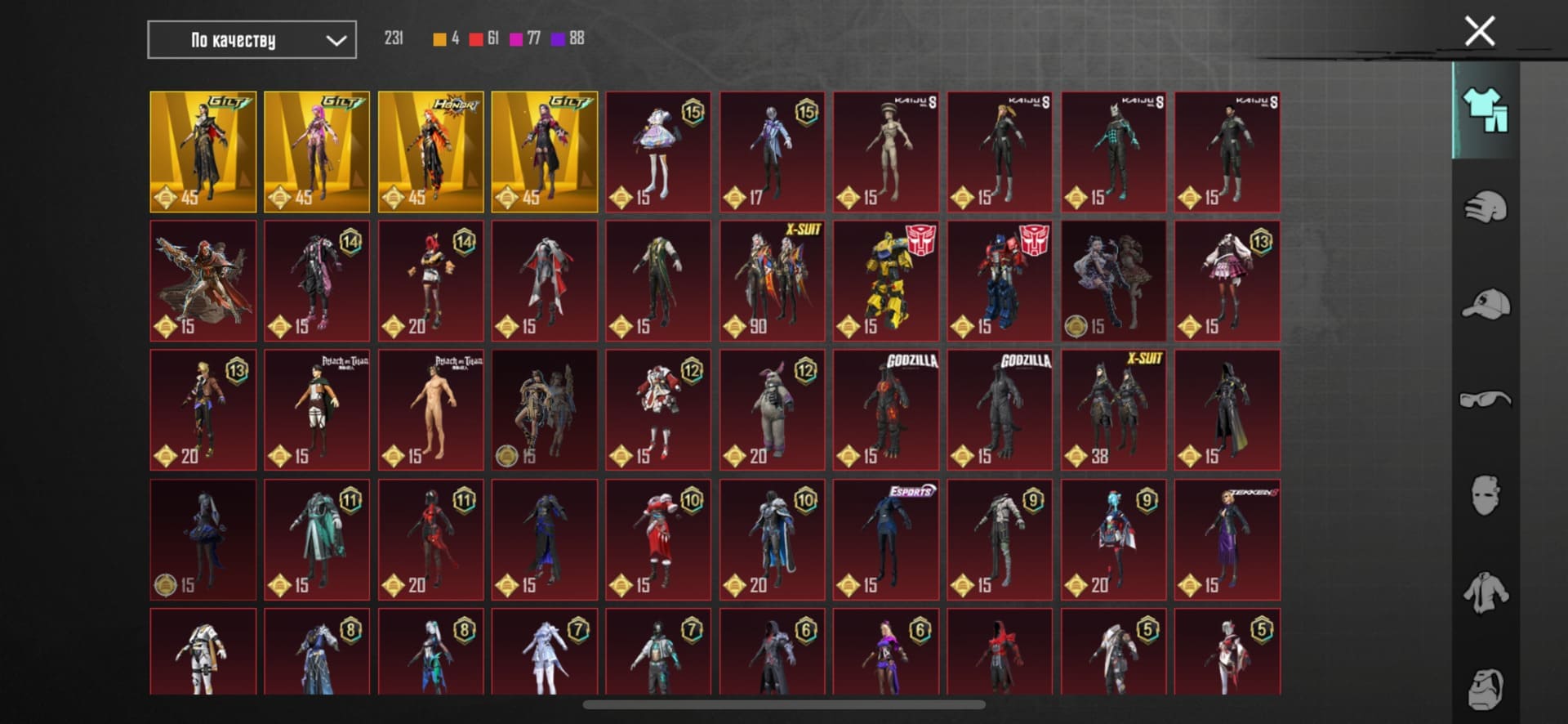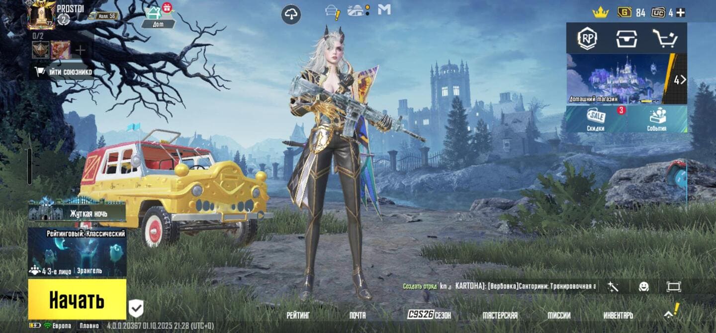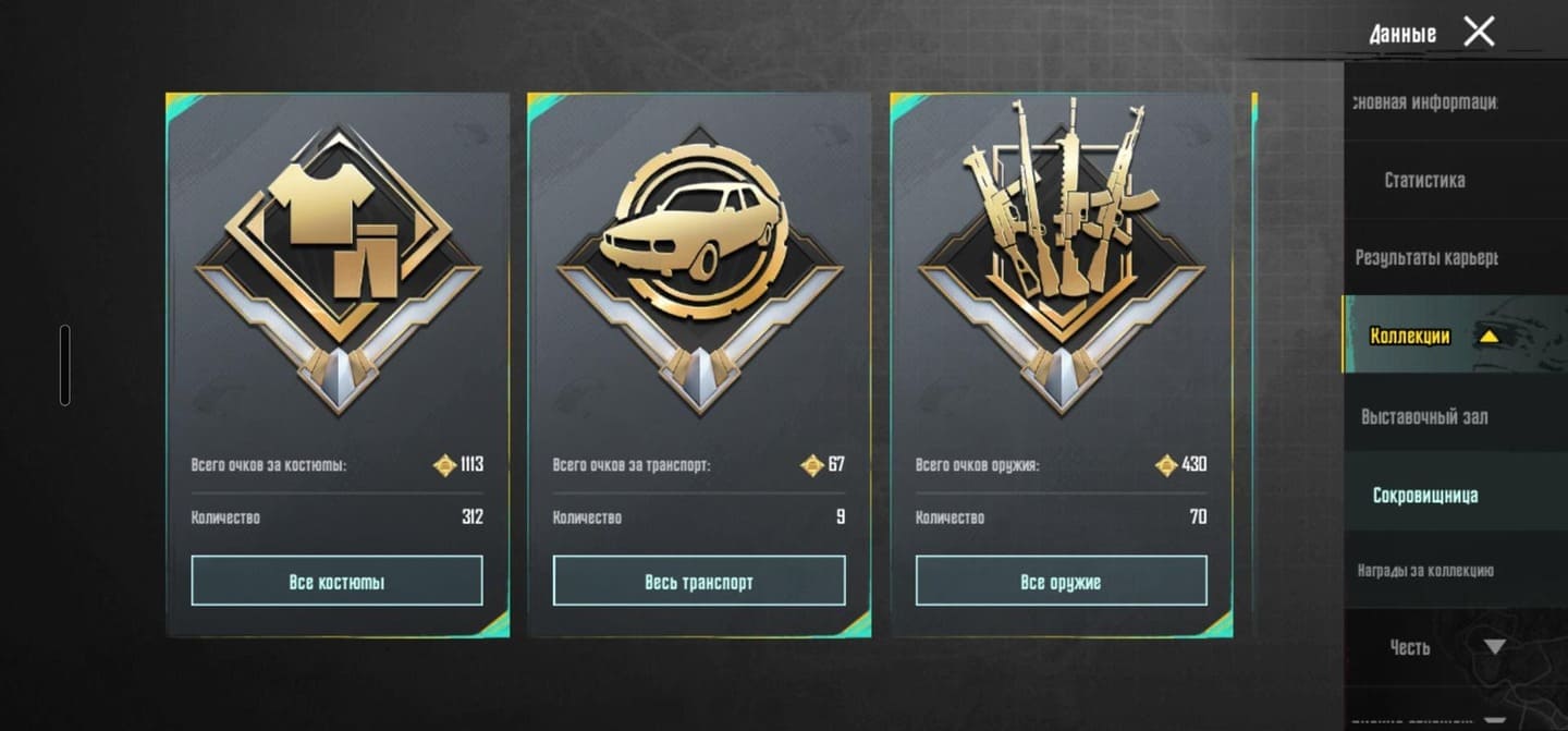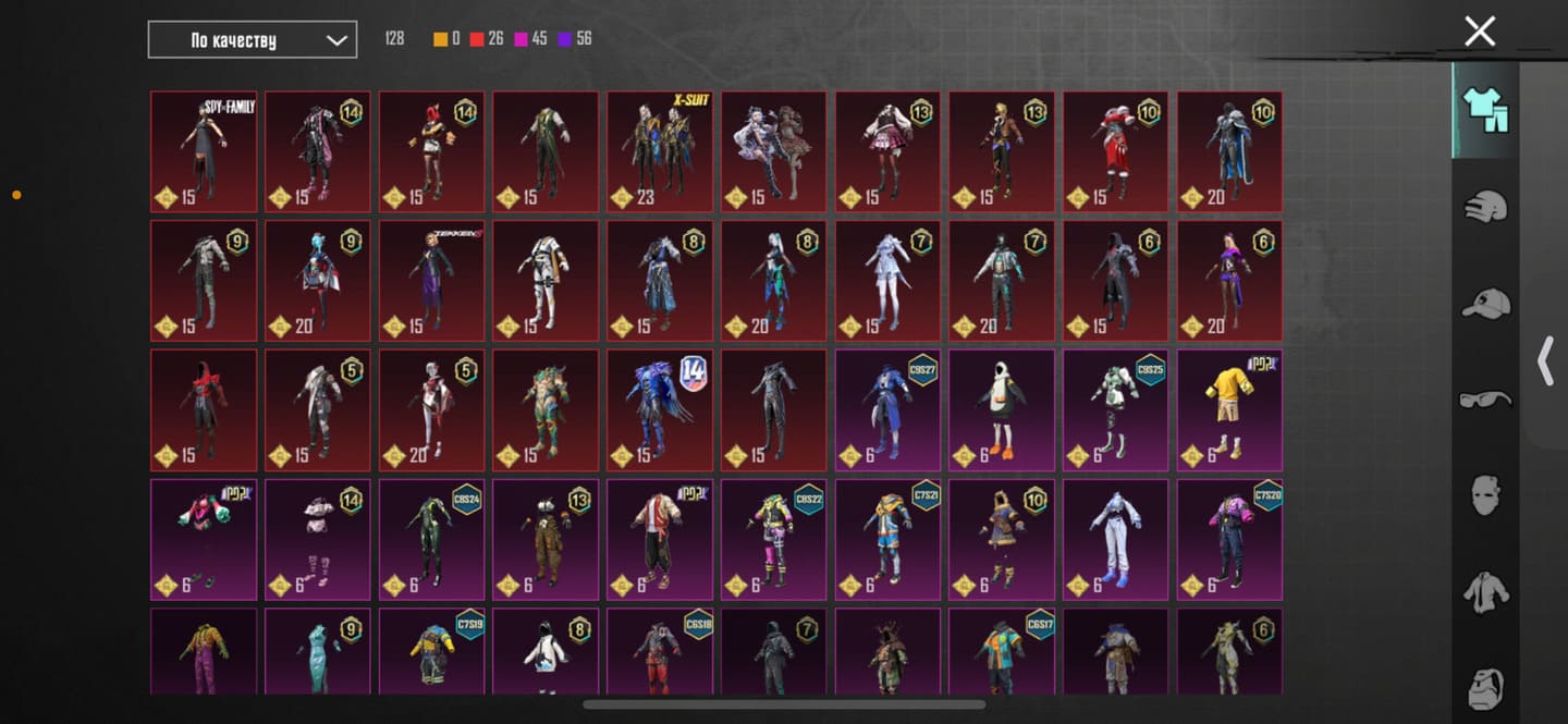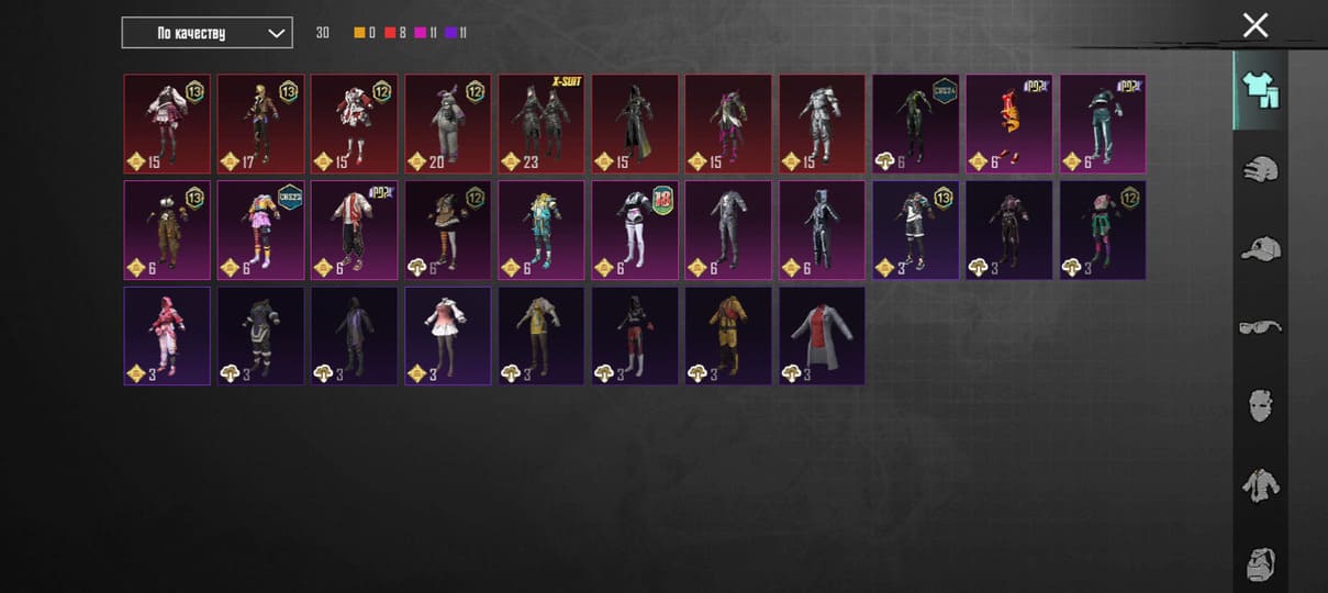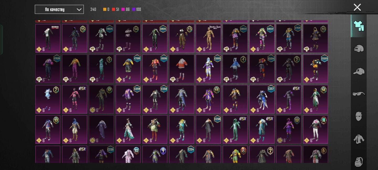 👚Топ костюмы: 51; ⭐️Royale Pass: с 4 сезонна; 🌈Скины на оружие: 25;